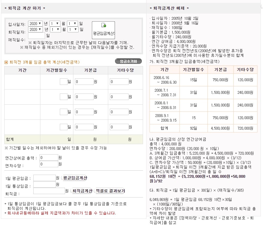 주의: 퇴직금계산기를 이용하지 않아도, 일부 회사는 퇴직연금제에 가입되어 있어서 퇴직금을 자동으로 계산해 줍니다. 하지만 이 금액은 바로 받을 수 있는 것이 아니라, 퇴직연금제에 따라 다를 수 있습니다.
