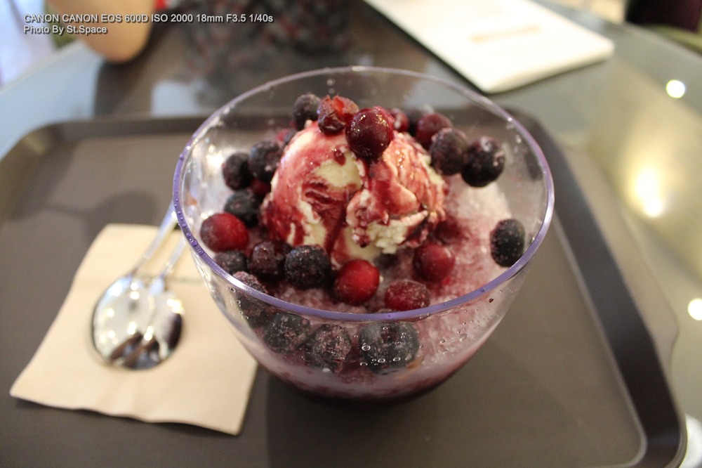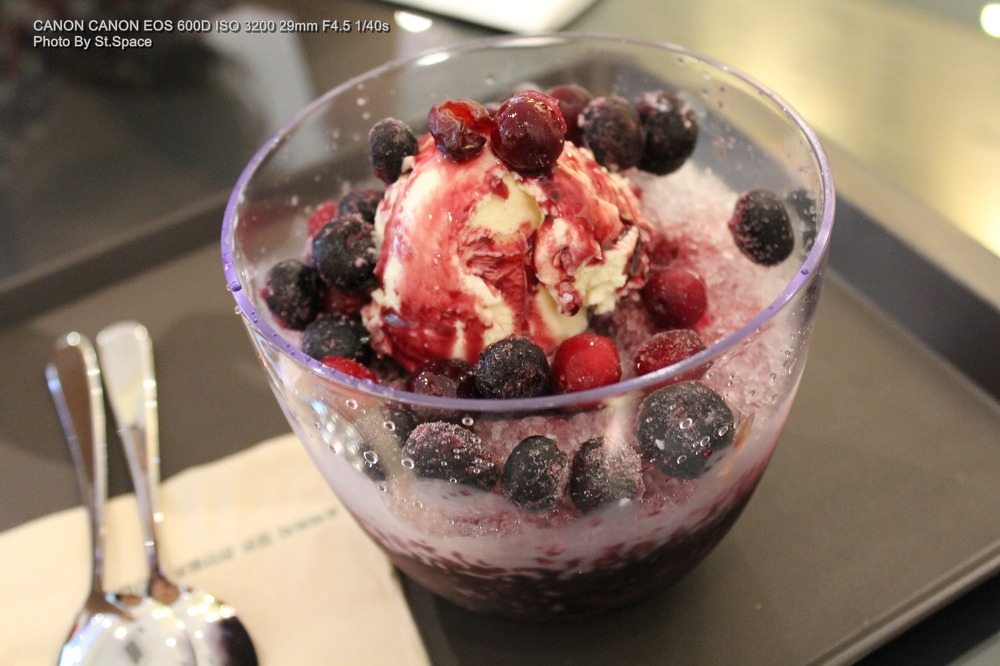 와인을 살짝 뿌린 빙수에 블루베리가 잔뜩 들어가 있어요~