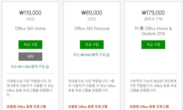 유료버전의 경우에도 처음부터 비싼 가격의 패키지 제품을 구입하는 것이 아닌, 월 8900원의 저렴한 가격으로 MS Office의 모든 제품을 사용할 수 있습니다.